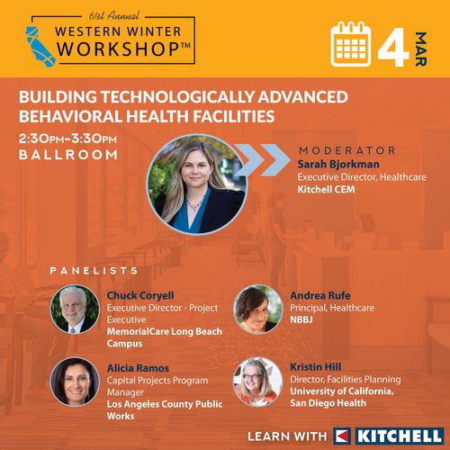 Kitchell CEM Executive Director Sarah Bjorkman will moderate “Building Technologically Advanced Behavioral Health Facilities” workshop. She will be joined by industry-leading panelists Chuck Coryell, Executive Director – Project Executive, MemorialCare Long Beach; Andrea Rufe, Principal, Healthcare, NBBJ; Alicia Ramos, Capital Projects Program Manager, Los Angeles County Public Works; and Kristin Hill, Director, Facilities Planning, University of California San Diego Health.