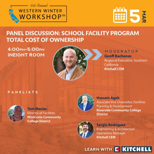Regional Executive Geoff Bachanas will moderate a panel focusing on the Total Cost of Ownership with School Facilities Programs. Geoff will lead panelists including Director of Facilities at MiraCosta Community College District Tom Macias, Riverside Community College District Associate Vice Chancellor of Facilities Planning & Development Hussain Agah and Kitchell Engineering & Architecture Operations Manager Sergio Rodriguez.